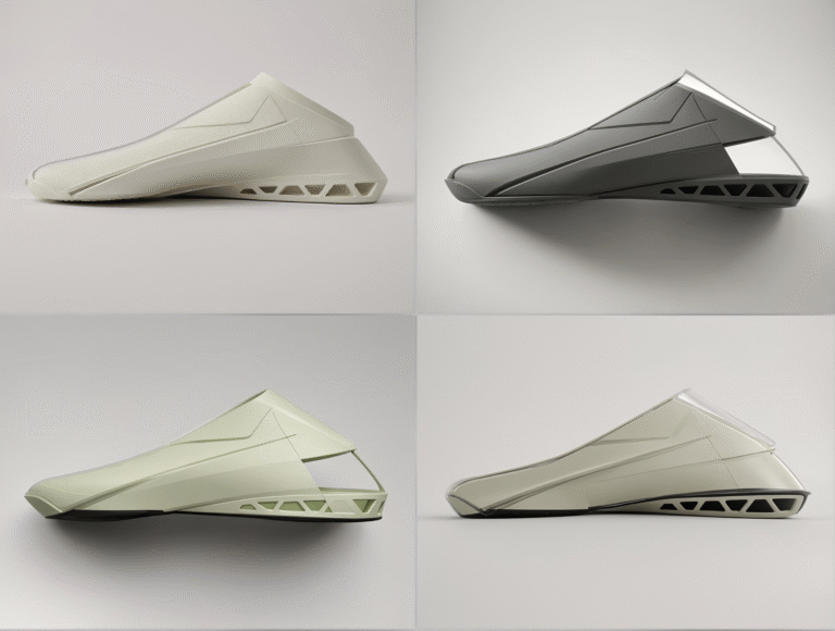 A series of futuristic slip-on footwear concepts exploring a single-piece shell construction, sharp geometric surfacing, and a lightweight cantilever-style sole. The design language focuses on clean silhouette, minimal seams, and structural venting to communicate performance, comfort, and a premium tech…