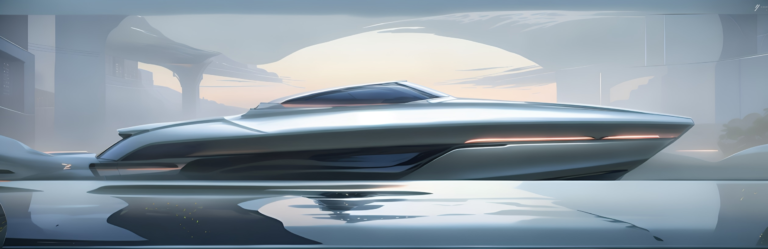 A retro-futurist high-speed craft concept defined by a single, uninterrupted silhouette and ultra-clean surfacing. The form emphasises visual lightness and aerodynamic flow, with a low canopy, knife-edge bow, and integrated light banding to reinforce speed, precision, and a premium “next-era”…