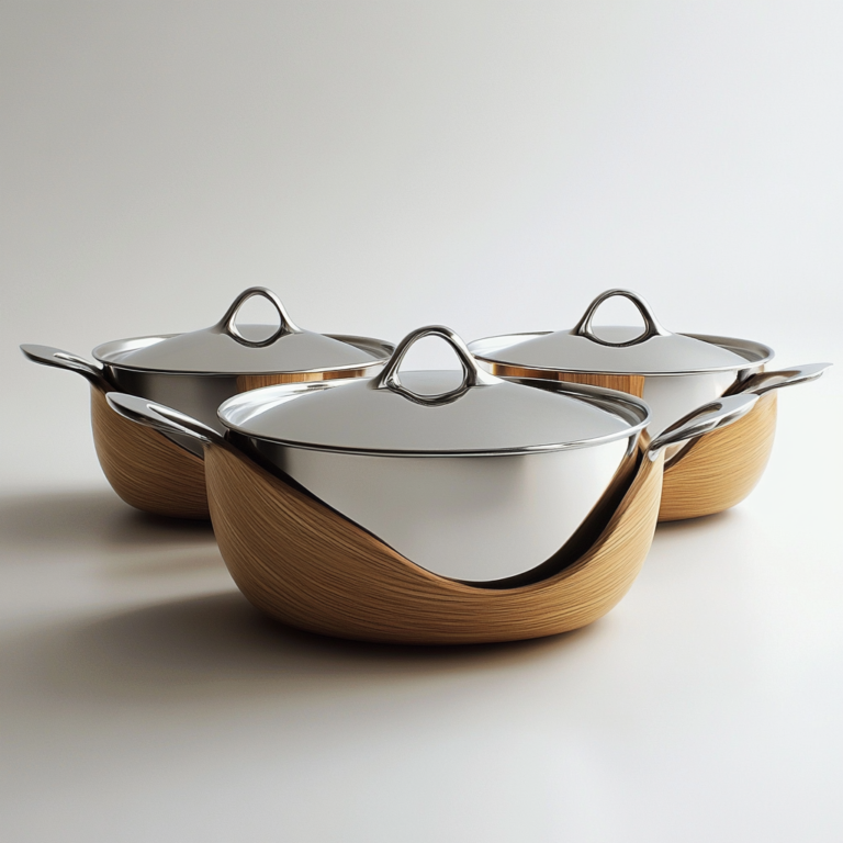 A premium cookware concept combining polished metal lids and rims with warm timber-wrapped bodies for a refined, contemporary kitchen aesthetic. The design focuses on soft, nested forms, ergonomic side handles, and clean detailing—balancing durability, heat performance, and tabletop-ready presentation.