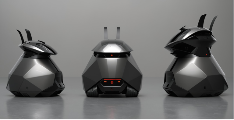 A low-profile, mobile security unit concept defined by faceted armor geometry, a compact wheelbase, and a sensor-rich head module. The design balances stealth and presence—hard-surface protection, integrated lighting cues, and a modular top assembly—built to communicate durability, autonomy, and a…