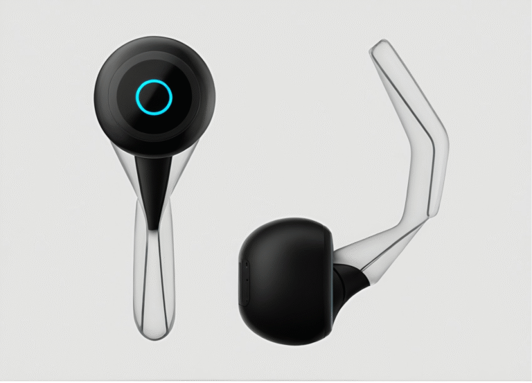 Minimal transparent earbuds design focused on comfort, acoustics intent, and visual clarity.